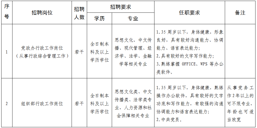 计划招聘工作人员若干名,具体岗位、学历条件、任职要求等详见附件1。