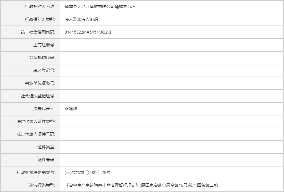 (云)应急罚〔2023〕28号郁南县大地红建材有限公司埇林界石场Z行政处罚案