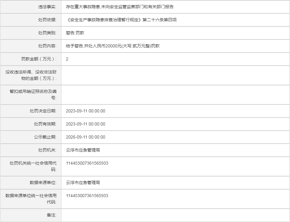 (云)应急罚〔2024〕33号中电建(云浮)绿色矿业有限公司行政处罚案