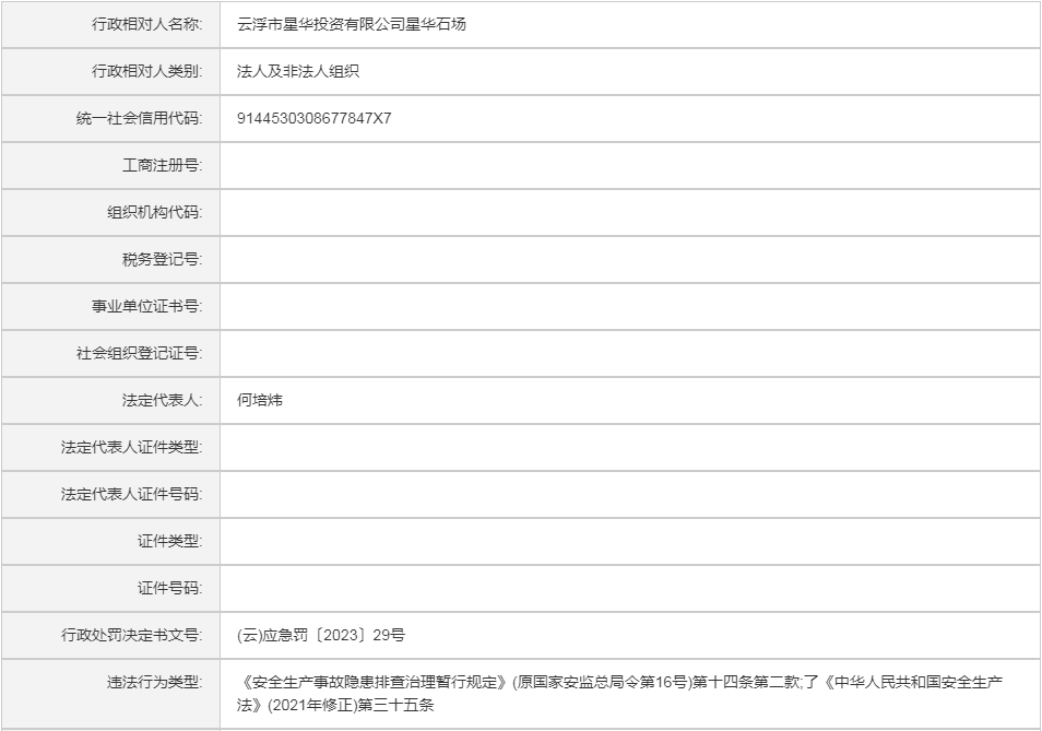 (云)应急罚〔2023〕29号云浮市星华投资有限公司星华石场行政处罚案