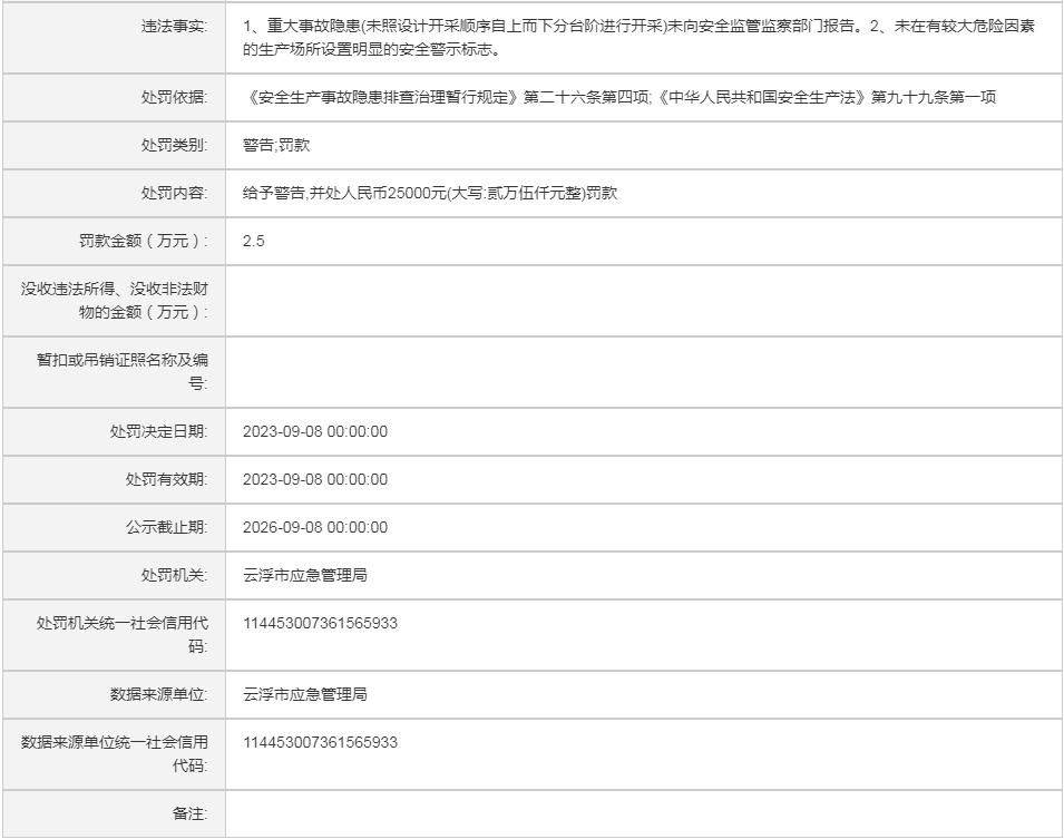 (云)应急罚〔2024〕33号中电建(云浮)绿色矿业有限公司行政处罚案