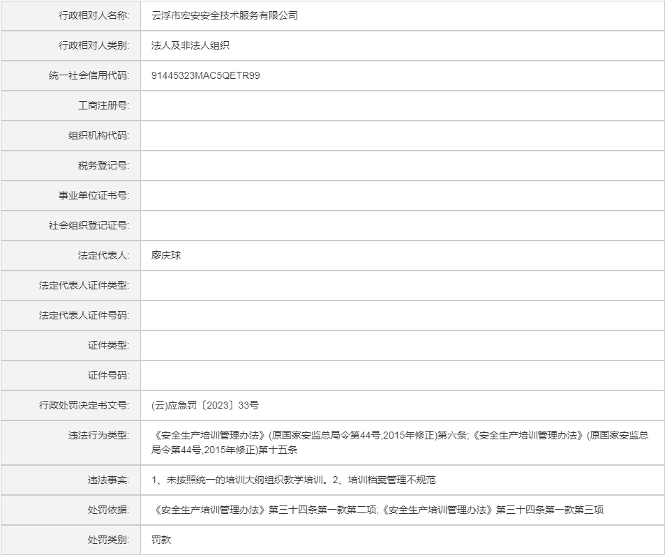 (云)应急罚〔2023〕33号云浮市宏安安全技术服务有限公司行政处罚案