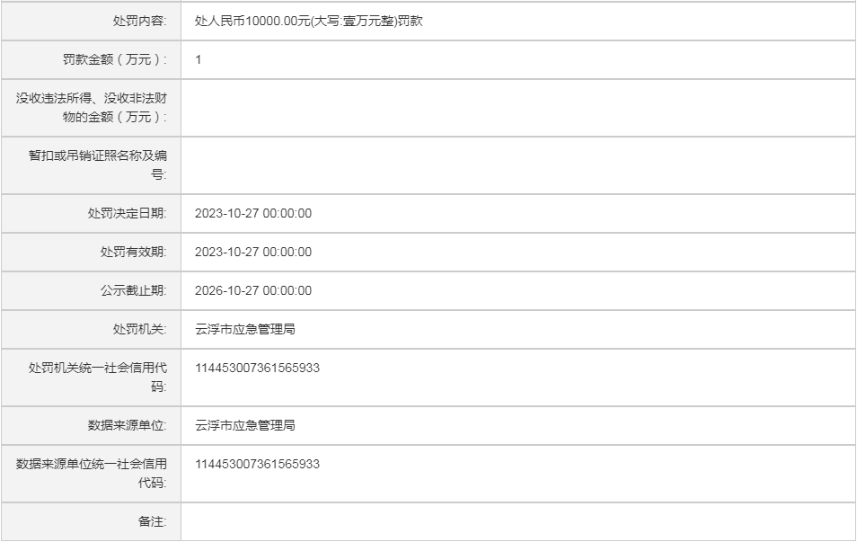 (云)应急罚〔2024〕33号中电建(云浮)绿色矿业有限公司行政处罚案