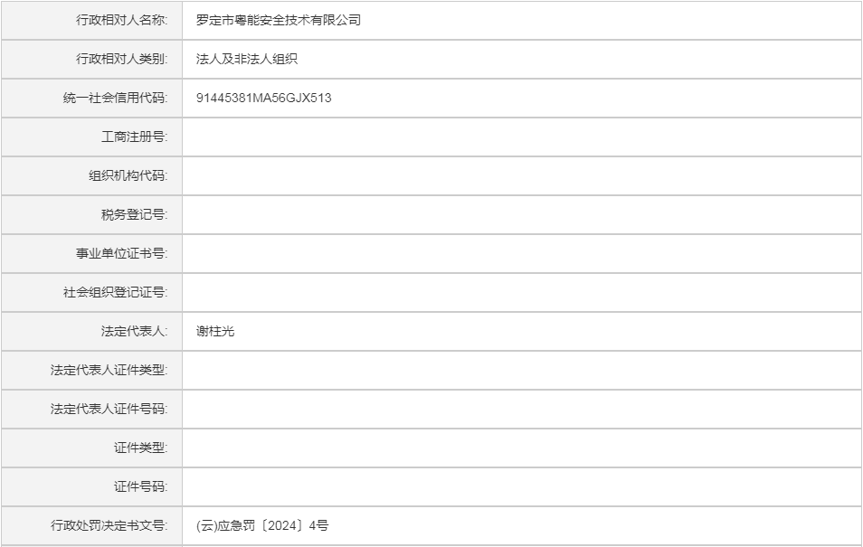 (云)应急罚〔2024〕4号罗定市粤能安全技术有限公司行政处罚案