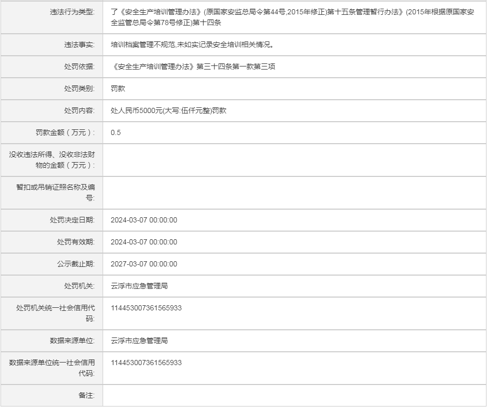 (云)应急罚〔2024〕33号中电建(云浮)绿色矿业有限公司行政处罚案