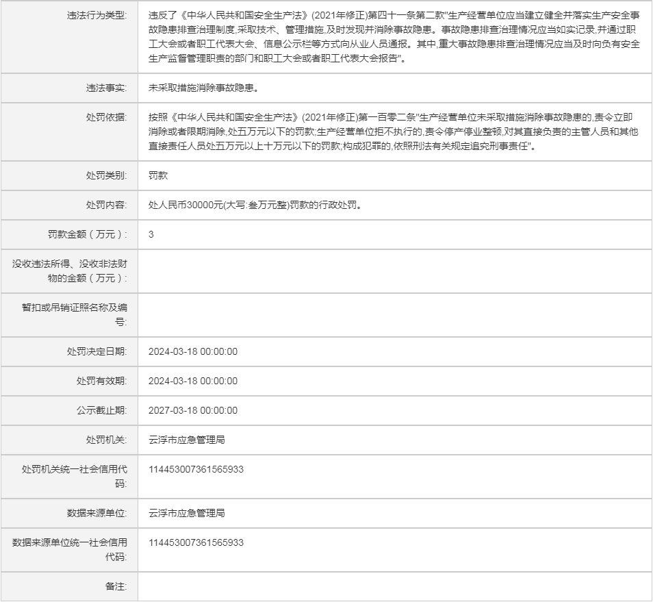 (云)应急罚〔2024〕33号中电建(云浮)绿色矿业有限公司行政处罚案