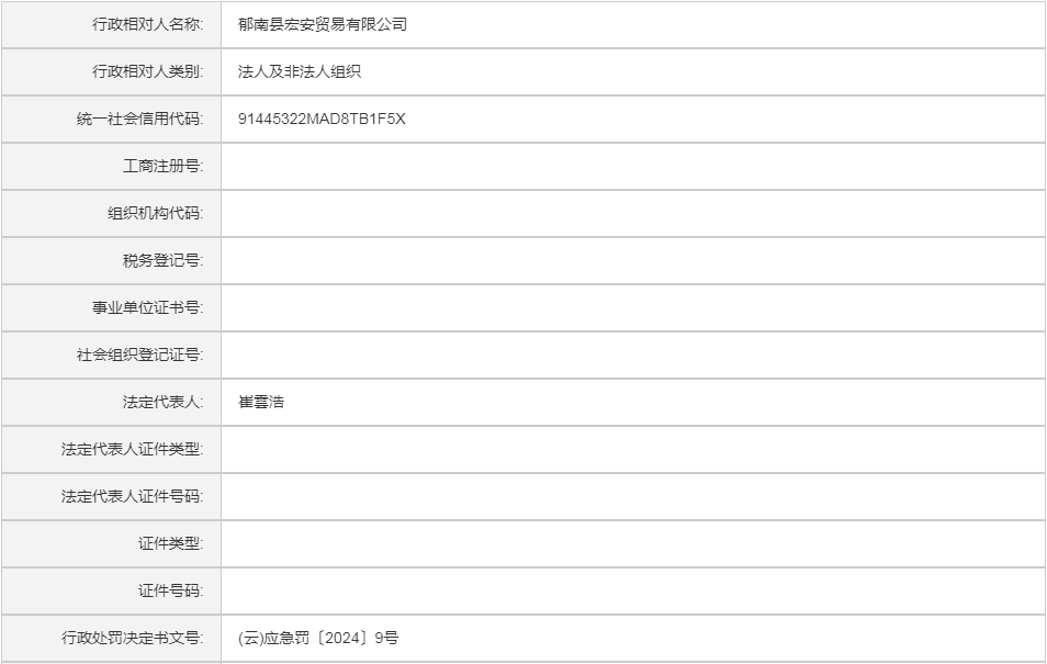 (云)应急罚〔2024〕9号郁南县宏安贸易有限公司行政处罚案