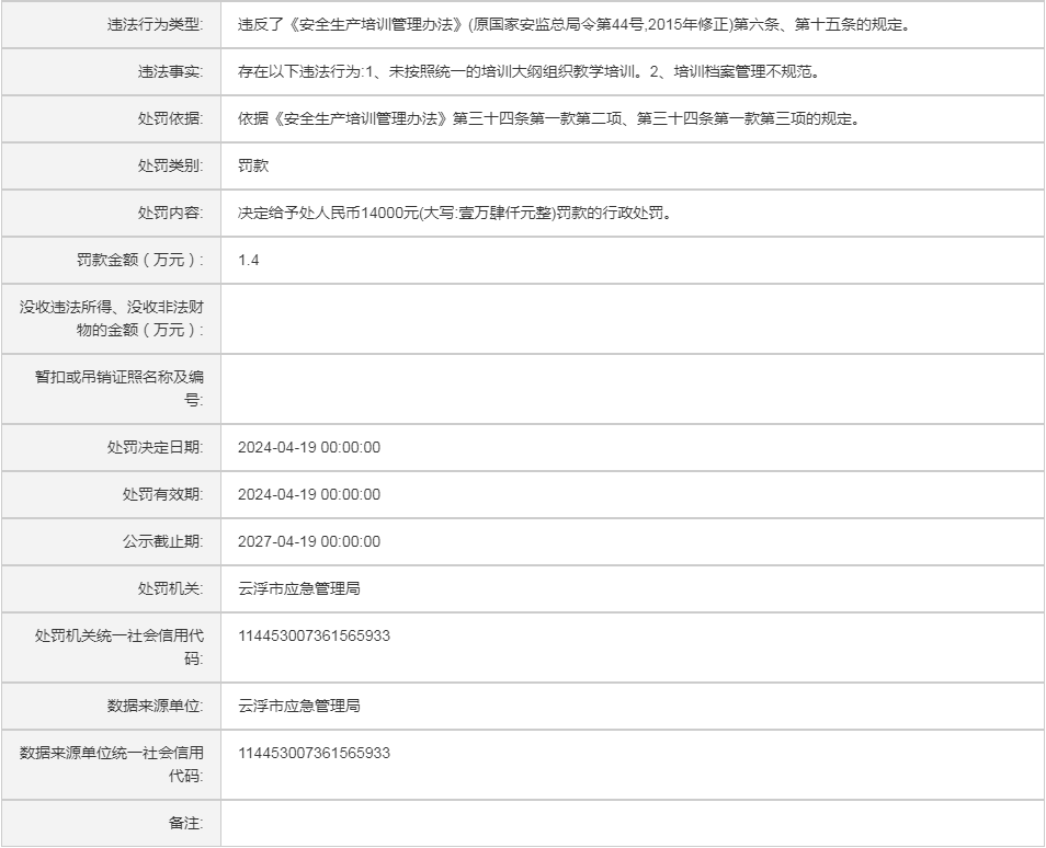 (云)应急罚〔2024〕33号中电建(云浮)绿色矿业有限公司行政处罚案