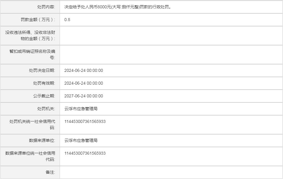 (云)应急罚〔2024〕33号中电建(云浮)绿色矿业有限公司行政处罚案