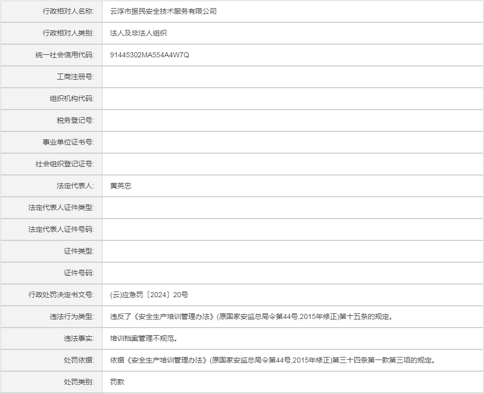 (云)应急罚〔2024〕20号云浮市振民安全技术服务有限公司行政处罚案
