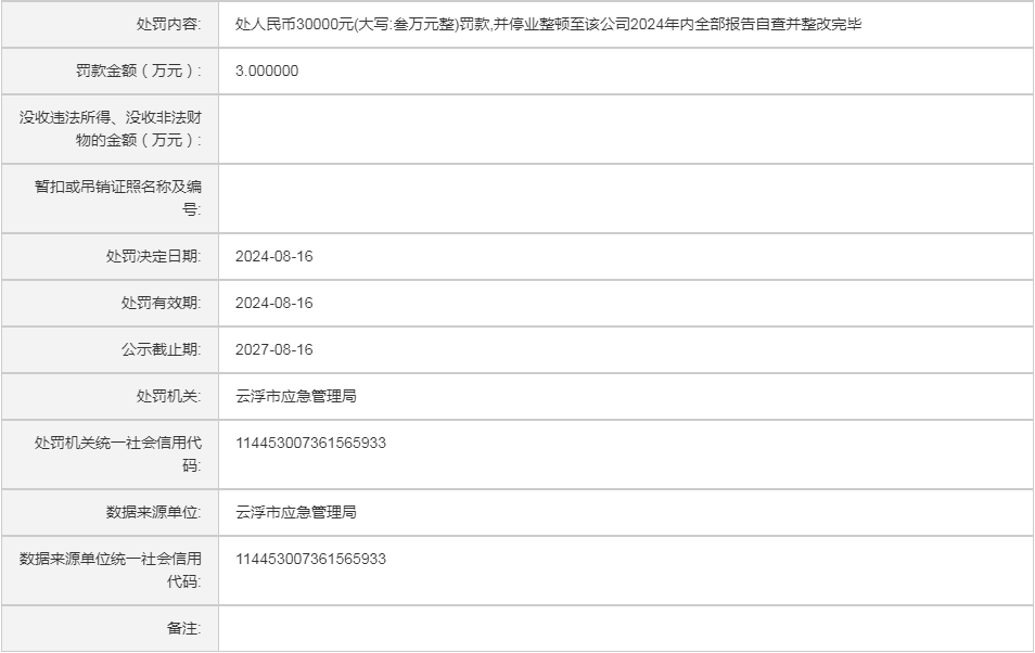 (云)应急罚〔2024〕33号中电建(云浮)绿色矿业有限公司行政处罚案