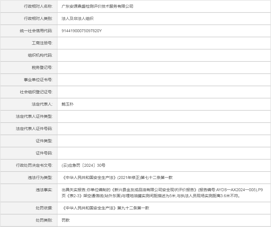 (云)应急罚〔2024〕30号广东安源鼎盛检测评价技术服务有限公司行政处罚案