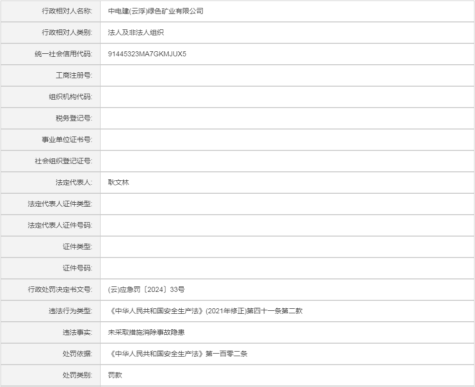 (云)应急罚〔2024〕33号中电建(云浮)绿色矿业有限公司行政处罚案
