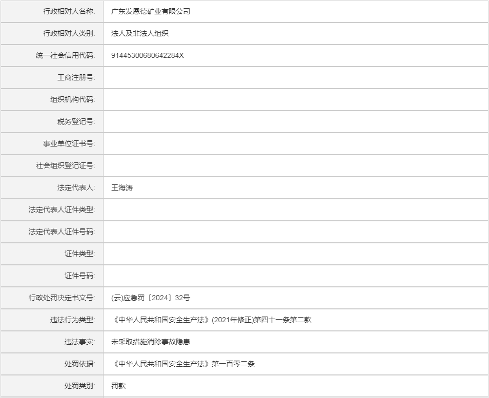 (云)应急罚〔2024〕32号广东发恩德矿业有限公司行政处罚案