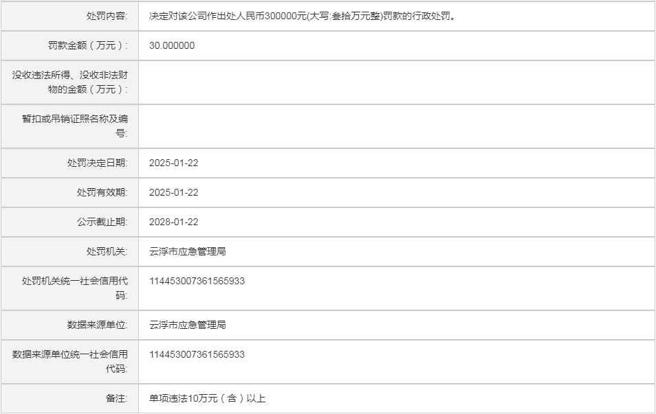 (云)应急罚〔2024〕33号中电建(云浮)绿色矿业有限公司行政处罚案