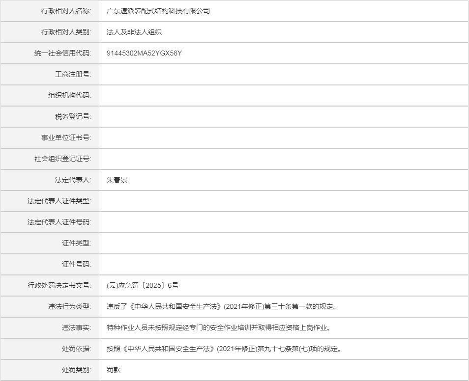 (云)应急罚〔2025〕6号广东速派装配式结构科技有限公司行政处罚案