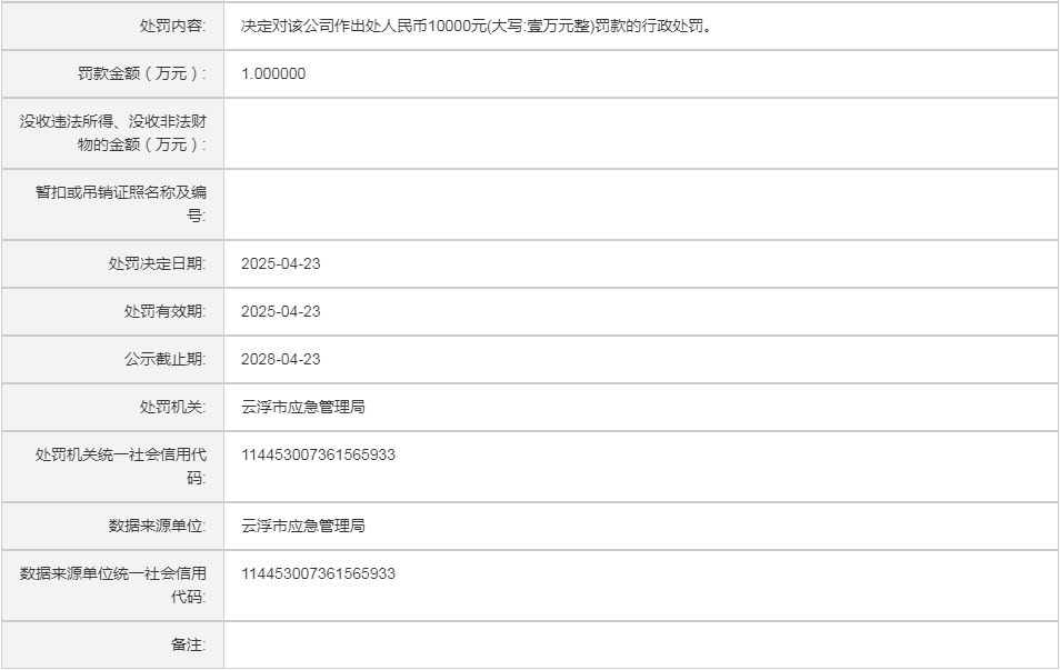 (云)应急罚〔2024〕33号中电建(云浮)绿色矿业有限公司行政处罚案
