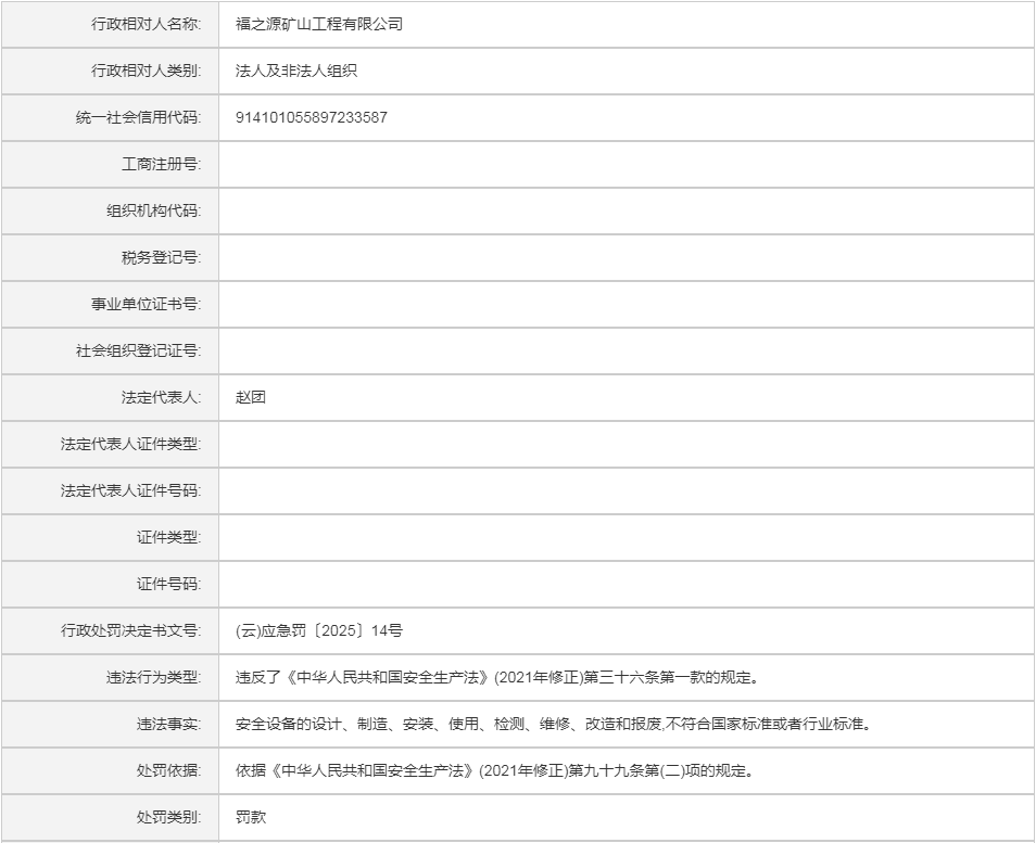 (云)应急罚〔2025〕14号福之源矿山工程有限公司行政处罚案