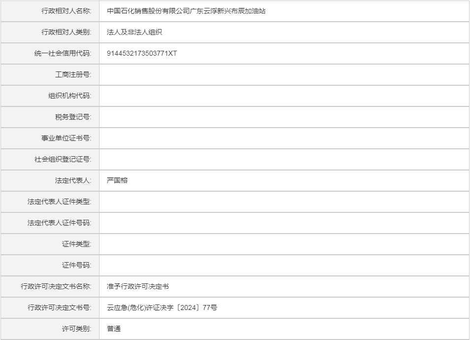 云应急(危化)许证决字〔2024〕77号中国石化销售股份有限公司广东云浮新兴布辰加油站危险化学品经营许可证(延期换证)