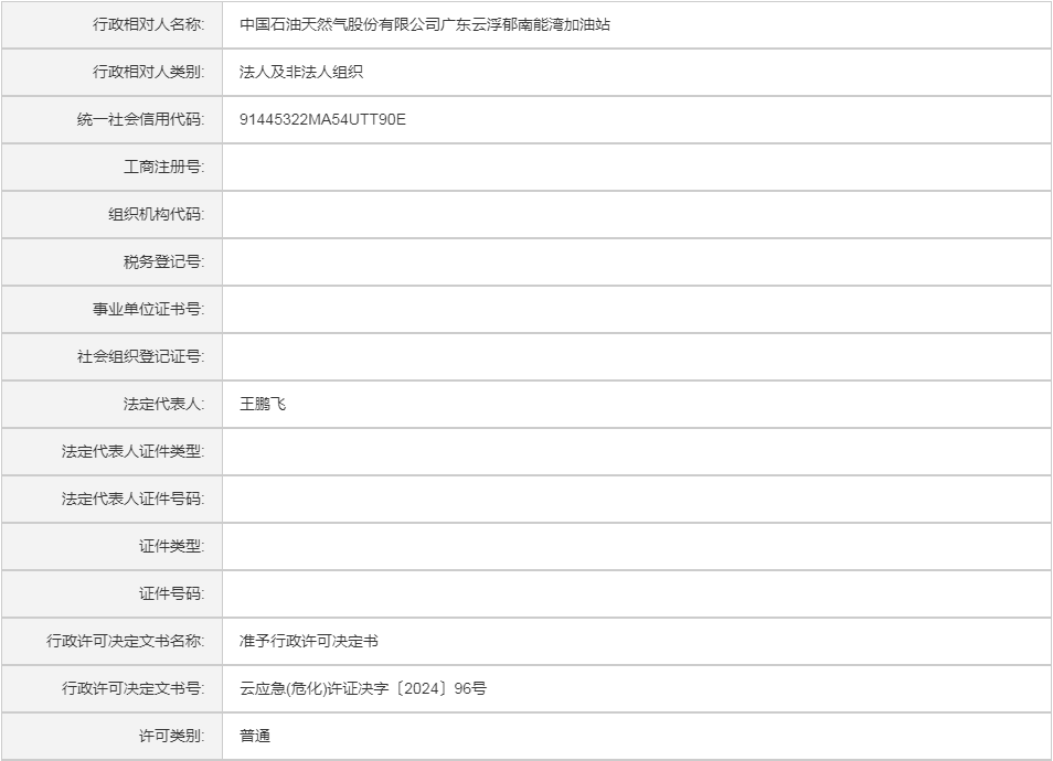云应急(危化)许证决字〔2024〕96号中国石油天然气股份有限公司广东云浮郁南能湾加油站危险化学品经营许可证(延期换证)