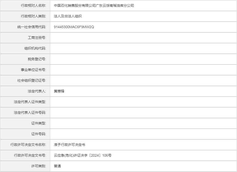 云应急(危化)许证决字〔2024〕106号中国石化销售股份有限公司广东云浮南瑶油库分公司危险化学品经营许可证(新领证)