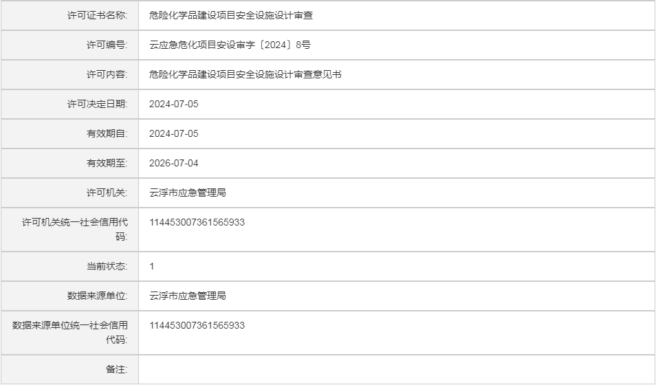 云应急(危化)许证决字〔2024〕123号永卓科技(云浮)有限公司危险化学品建设项目安全设施设计审查意见书