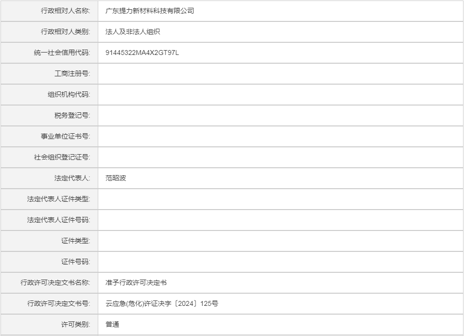 云应急(危化)许证决字〔2024〕125号广东提力新材料科技有限公司危险化学品安全生产许可证(变更换证)