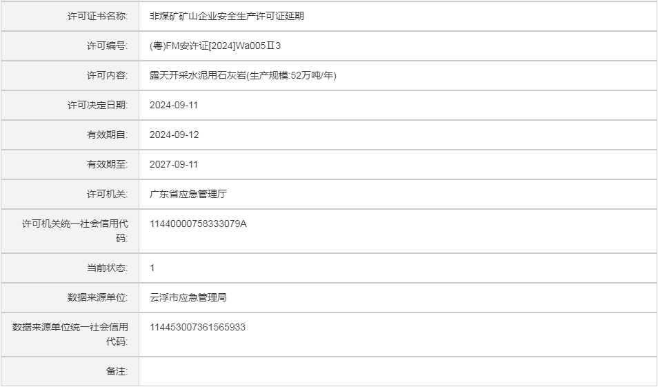粤(非煤)安许证决字[2024]W07号云浮市中材新发矿业有限公司云安宝岩石场露天开采水泥用石灰岩(生产规模:52万吨/年)