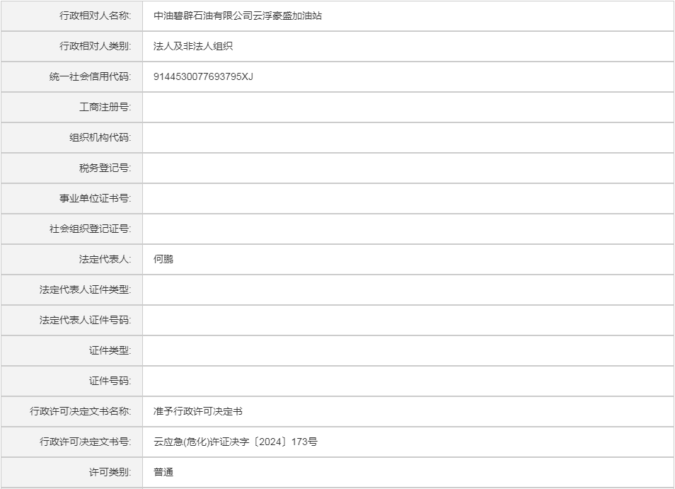 云应急(危化)许证决字〔2024〕173号中油碧辟石油有限公司云浮豪盛加油站危险化学品经营许可证(变更换证)