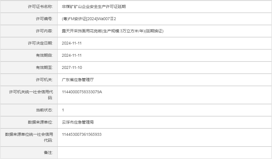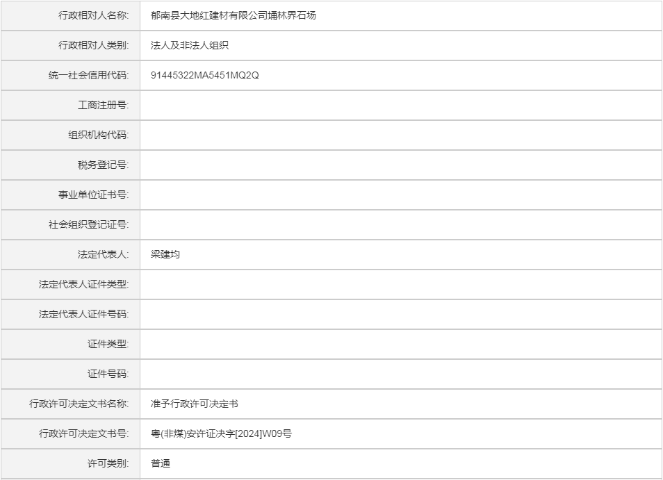 粤(非煤)安许证决字[2024]W09号郁南县大地红建材有限公司埇林界石场露天开采饰面用花岗岩(生产规模:3万立方米/年)(延期换证)