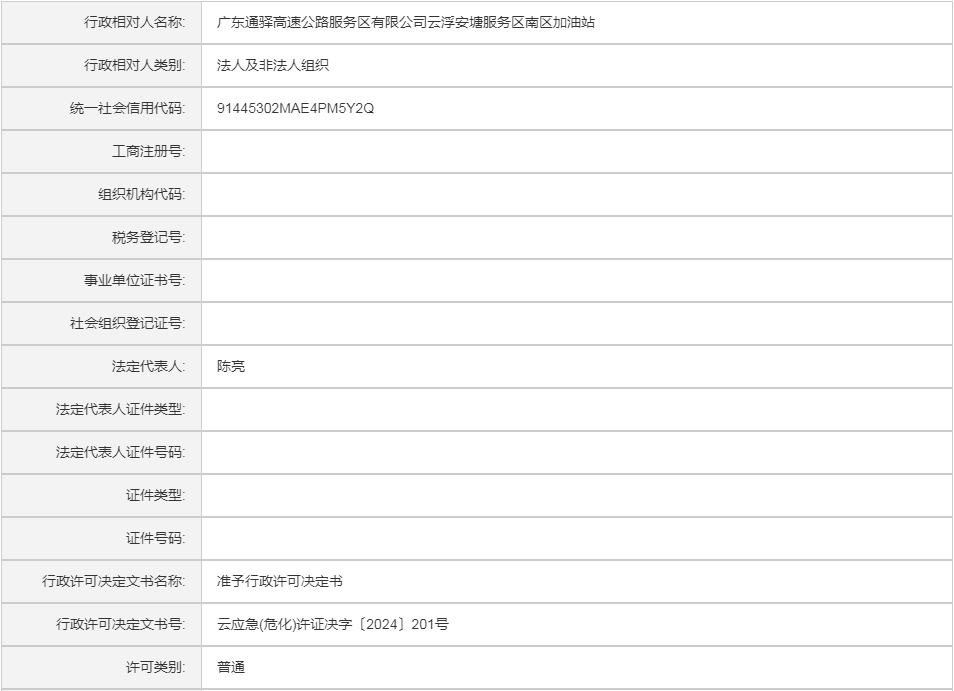 云应急(危化)许证决字〔2024〕201号广东通驿高速公路服务区有限公司云浮安塘服务区南区加油站危险化学品经营许可证(变更换证)