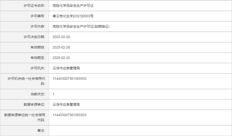 云应急(危化)许证决字〔2025〕13号云浮市银利化工有限公司危险化学品安全生产许可证(延期换证)