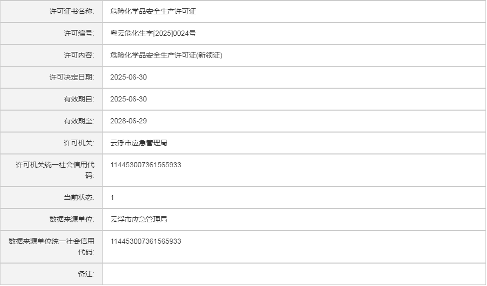 云应急(危化)许证决字〔2025〕45号云浮市美华油脂化工有限公司危险化学品安全生产许可证(新领证)