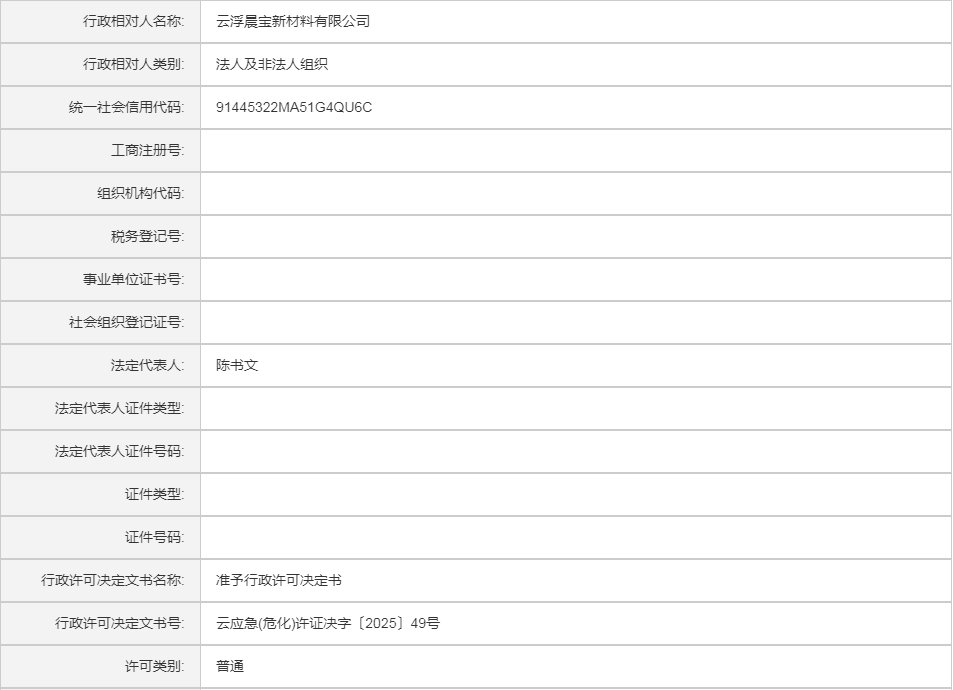 云应急(危化)许证决字〔2025〕49号云浮晨宝新材料有限公司危险化学品安全生产许可证(延期换证)