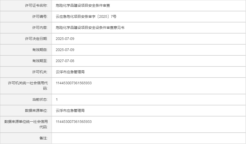 云应急(危化)许证决字〔2025〕50号广东云硫联发化工有限公司云安分公司危险化学品安全生产许可证(变更换证)