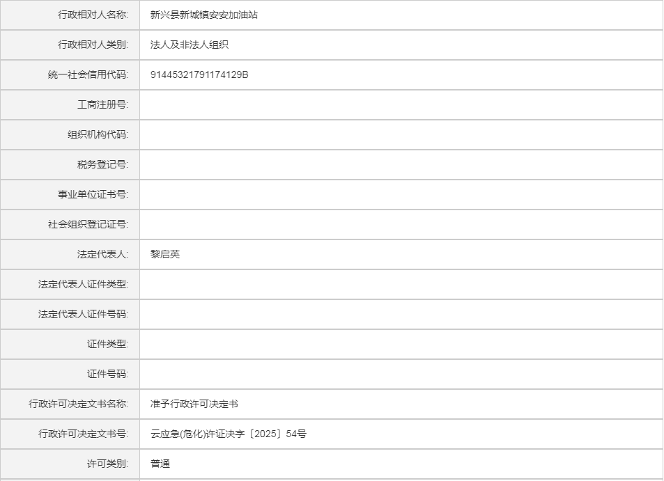 云应急(危化)许证决字〔2025〕54号新兴县新城镇安安加油站危险化学品经营许可证(延期换证)