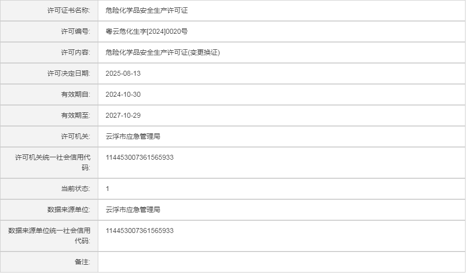 云应急(危化)许证决字〔2025〕56号嘉神(云浮)新材料科技有限公司危险化学品安全生产许可证(延期换证)