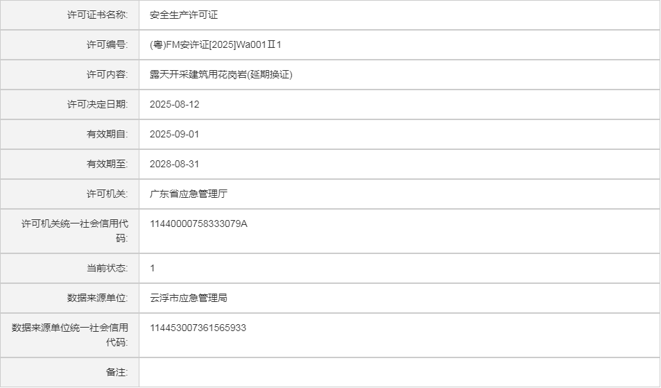 粤(非煤)安许证决字[2025]W01号云浮市华茂石业有限公司云安向阳石场露天开采建筑用花岗岩(延期换证)