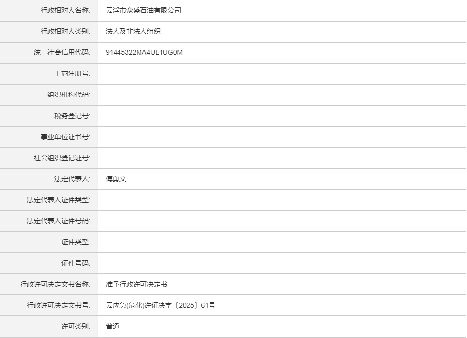 云应急(危化)许证决字〔2025〕61号云浮市众盛石油有限公司危险化学品经营许可证(变更换证)