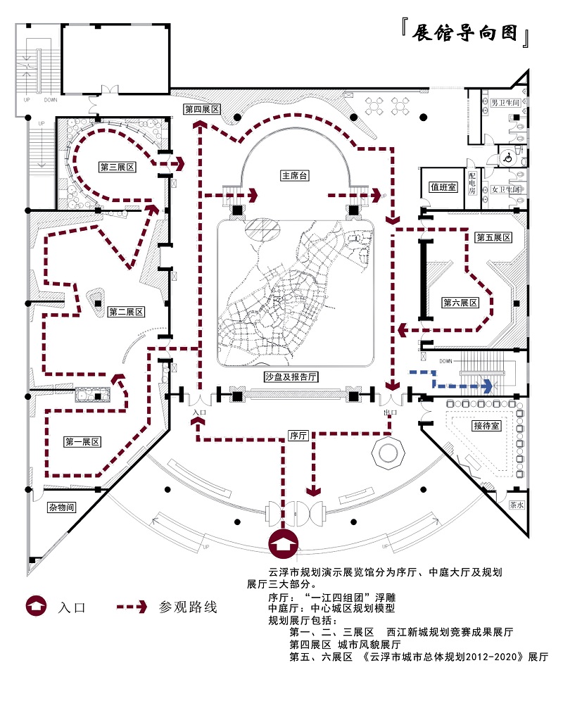 为展现我市历史文化底蕴、自然生态优势,以及城乡规划建设成就和发展目标,让广大市民认识城市、了解城市、提高公众对城市规划建设的参与度和认可度,增强对云浮的归属感,拓宽招商引资宣传渠道,打造展示云浮的新窗口,助推我市经济、社会、文化事业更好更快发展,市委、市政府决定筹建云浮市规划演示展览馆。 一、主题及定位 展馆主题:以我市历史变迁和深邃文化为背景,以城市规划为载体和主线,以展现城市未来发展蓝图为铺陈,全面展示我市独具魅力的历史文化和山水生态宜居城市美景,充分体现我市祥和、深厚的文化底蕴和雅致、休闲、亲切的城市规划建设风格。 展馆定位:以服务市民为主,体现亲民理念,鼓励公众参与。 二、概况 云浮市规划演示展览馆设在云浮市博物馆首层,面积约为1270平方米,2009年9月24日开始投入使用,12月28日正式开馆。云浮市规划演示展览馆布展重点为入口序厅、中庭模型、观众席、天幕,以及首层四周展厅。以中庭的沙盘模型为中心,辐射各展区。展馆设计突出云浮市社会经济发展理念,以城市规划为载体和主线,全面展示云浮市的历史文化底蕴和山水生态宜居城市美景,体现云浮市生态、文明、智慧、休闲的城市规划建设风格。布展形式有沙盘、模型、图纸、图片、实物、多媒体影音等。展馆分为序厅、中庭大厅以及规划展区。其中,序厅浮雕主要展示“一江四组团”的规划格局;中庭主体模型主要展示市城区规划建设成效;规划展区主要以“云浮市城市总体规划”为重点展示城乡规划建设蓝图。 三、主要布展内容 (一)入口序厅 正面为云石浮雕,展示云浮“一江四组团(西江、西江新城组团、云城组团、思劳腰古组团、六都组团)”的规划内容,镶嵌“云浮—广东大西关”主题字样。 (二)大厅 序厅浮雕背面为投影屏幕,投影屏幕下方为沙盘模型,对面设观众席。中庭天幕安装电动遮光帘,光线调节配合大型投影屏幕播放《生态文明,幸福云浮》专题片,及进行模型解说。中庭两侧展墙展示规划成果。 (三)两大展厅 中庭大厅左右两侧的展厅分别为:西江新城规划竞赛成果展厅、 《云浮市城市总体规划2012-2020》展厅 。 四、展馆导向图 |