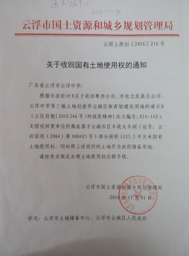 关于收回国有土地使用权的通知(云国土规划[2016]216号)