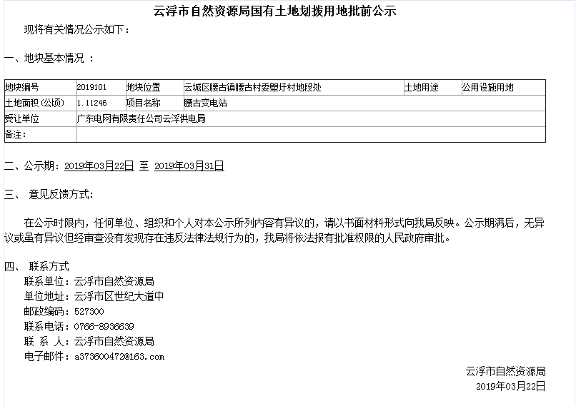 云浮市自然资源局国有土地划拨用地批前公示(云自然资(划)[2019]001号)