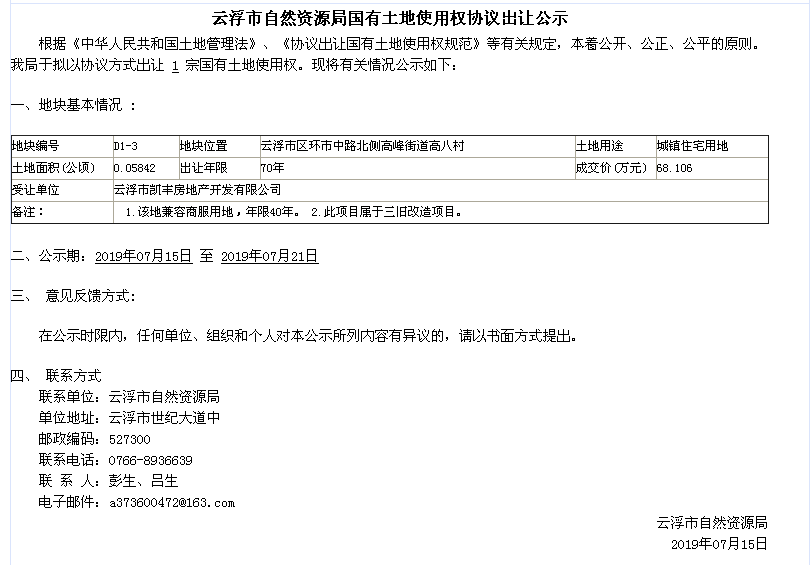 云浮市自然资源局国有土地使用权协议出让公示(2019-001)