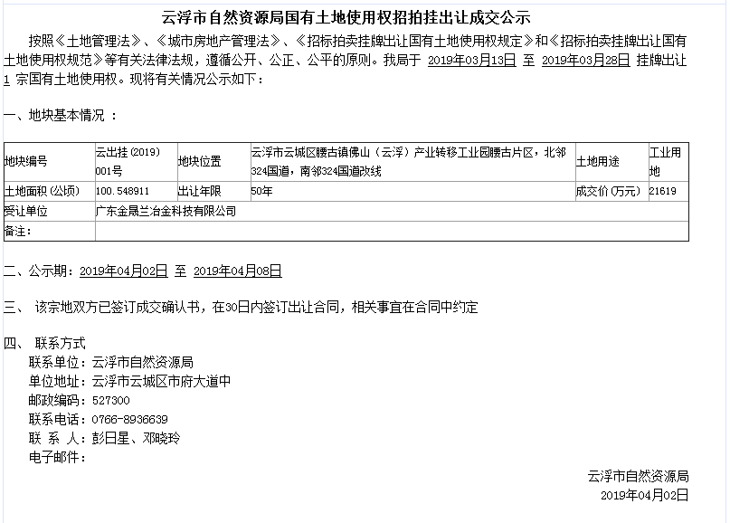 云浮市自然资源局国有土地使用权招拍挂出让成交公示