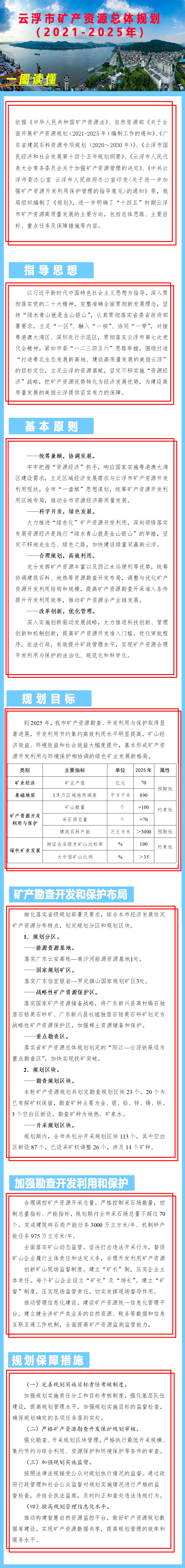 各县(市、区)人民政府,市直有关部门: 我局组织编制的《云浮市矿产资源总体规划(2021-2025年)》经市人民政府同意报省自然资源厅审核,已经省自然资源厅批准,现印发给你们,请结合实际,认真组织实施。规划组织实施过程中的重大进展与存在问题,请径向我局反映。 2、一图读懂《云浮市矿产资源总体规划(2021-2025年)》 云浮市自然资源局 2023年3月31日 |