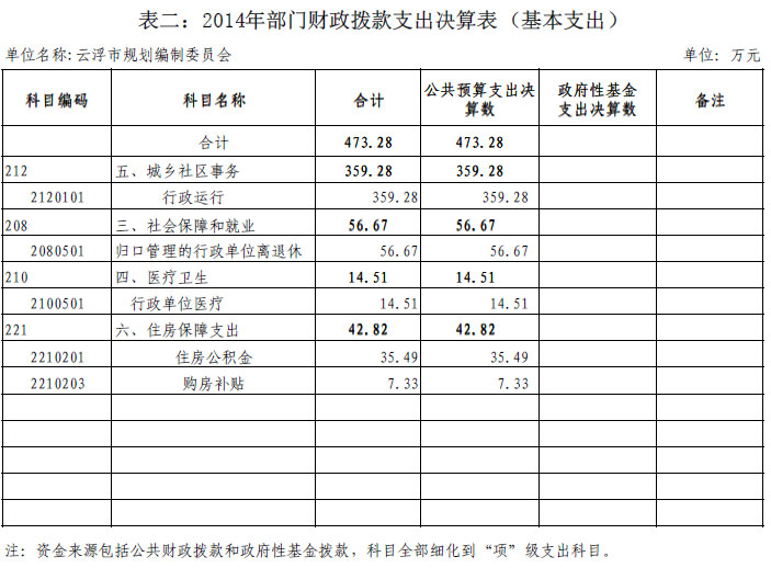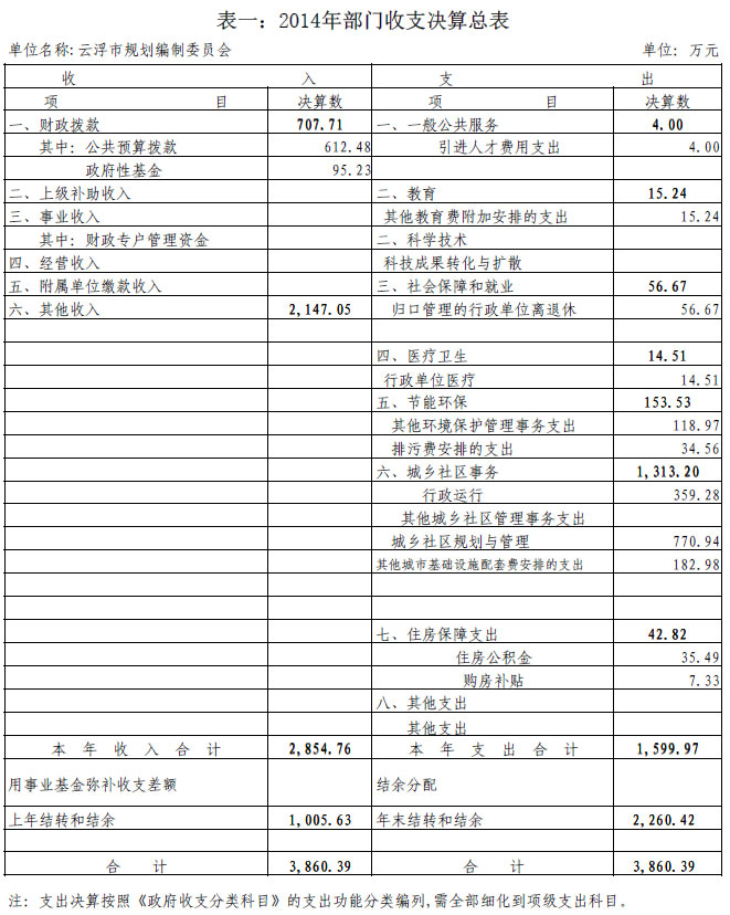 2014年云浮市规划编制委员会部门决算基本情况说明 一、部门基本情况 (一)部门机构设置、职能 1.部门职能:负责牵头组织制订全市资源环境城乡区域统筹发展规划、全市国民经济和社会发展总体规划、城乡总体规划及土地利用总体规划,负责协调组织制订和组织审查全市各部门各项专项规划并监督其组织实施。 2.机构情况:机构内设综合科、规划科、市政和用地管理科、信息管理科、规划监察科、规划技术科,归口管理下属事业单位市城乡规划编制研究中心(以下简称“编研中心”)、市地理信息中心(以下简称“信息中心”)。 (二)人员构成情况 人员情况:现有在册人数46人,其中:行政人员(财政拨款19人,事业人员(财政拨款,事业单位编研中心和信息中心人员)27人。退休人员10人(属财政拨款)。 (三)决算年度的主要工作任务 2014年,在市委、市政府的正确领导下,我委认真开展党的群众路线教育实践活动,强化规划职能,努力做到“两手抓、两促进”,以攻坚的劲力、改革的措施、实干的作风,扎实推进组织编制规划、深化“三规合一”、加强规划服务等各项工作。 二、收入决算说明 2014年收入决算2854.76万元。其中:1、财政拨款收入707.71万元(公共预算拨款612.48万元,政府性基金95.23万元); 2、其他收入2147.05万元,包括:1月26日财政行政科在上年结转直接支付拨2013年至2014年规划编制及测绘经费2027.52万元,市财政在财政专户统筹收入核拨经费118.98万元(包括5月8日财政综合科拨云浮市规划演示展览馆2014年度办公经费5万元、5月8日财政综合科拨广东中意<云浮>产业园规划编制工作经费28万元、7月28日市财政局综合科拨购置测绘仪器经费14.8万元<在市城市规划测量队上缴财政专户统筹收入核拨>、8月27日市财政局综合科核拨云浮市城乡规划委员会工作经费10万元、10月21日市财政局综合科核拨市规划演示展览馆展厅天花板维修经费4.38万元、12月11日市财政局综合科核拨云浮市中心城区云城组团城市建设规划管理通则<试行>编制经费28.8万元、12月17日云浮市中心城区扩容提质建设规划编制经费28万元)和利息收入0.55万元。 三、支出决算说明 2014年支出决算1599.97万元,其中:财政拨款支出1599.97万元。 2014年财政拨款支出按用途划分,基本支出473.28万元,占30%,其中:工资福利支出345.94万元,对个人和家庭的补助92.16万元,商品和服务支出35.18万元。项目支出决算1126.69万元,占70%,主要支出项目包括: 云浮西江新城中央商务区综合交通枢纽项目规划及建筑方案设计国际竞赛工作设计费用107.07万元,南广铁路站场及中央商务区周边地形1:1000全野外数字化地形修测地形测绘(南广铁路站场及中央商务区周边、产业园区周边地形测绘)6.47万元,都杨产业园区周边地形1:1000全野外数字化地形修测地形测绘(南广铁路站场及中央商务区周边、产业园区周边地形测绘)16.63万元,西江沿岸1:500全野外数字化地形测量测绘(云浮西江新城西江沿岸1:500地形测绘)8.74万元,云浮市西江新城水景中轴线周边1:500地形测绘54.32元,六都组团启动区1:1000地形测绘46.20万元,云浮西江新城中央商务区城市设计深化设计费用70万元,云浮新区发展建设社会稳定风险评估费用16.2万元,云浮市绿道网建设总体规划设计费14.4万元,云浮西江新城综合管网规划设计费34.56万元,云浮市教育园区展厅教育园区模型制作费15.24万元,云浮新区发展建设总体规划产业发展专项规划费45.5万元,云浮新区发展建设总体规划基础设施建设专项规划费49.6万元,六都组团分区专项规划14.7万元;云浮西江新城控制性详细规划设计费87元,六都组团启动区控制性详细规划设计费72万元,云浮西江新城重点片区后续深化工作和控规编制完善工作规划设计费24万元,云浮西江新城水景中轴线及滨江公园城市(景观)设计方案国际竞赛相关工作深化设计费24.28万元,云浮市云城街、罗定市泗纶镇、云安县南盛镇、罗定市罗镜镇(共4个,每个5万元)名镇建设规划设计费20万元,云浮西江新城部分片区控制性详细规划设计费41.97万元,1条贫困村和6条生态文明村数字化地形测绘测量费17.5元,广东中意(云浮)产业园规划编制设计费14万元,购置测绘仪器一批14.8万元,云浮市城乡规划委员会工作费用2.14万元,地形图数据规整工具软件费用17.76元,控规数据整理与数据建库系统费用9.76万元,控规数据整理与数据建库系统费用11.86万元,信息中心购置办公电脑和工作站服务器5.61万元, 云浮市城市总体规划宣传费3万元,云浮市城市总体规划公示展览制作费用8.62万元,云浮市城市总体规划技术咨询费(追加)补充余款26万元,云浮市城市总体规划技术咨询费余款36万元,云浮市城市总体规划充实完善技术咨询费29.5万元,规划演示展览馆展厅天花板维修费用4.38万元,云浮市中心城区云城组团城市建设规划管理通则(试行)编制费用28.8万元,云浮市中心城区扩容提质建设规划编制费用14万元,云城区国道324沿线企业户外广告规范管理及环境整治规划-广梧高速云浮东出口段规划设计费用25万元,广东省岭南近代建筑图集云浮分册编辑费用0.35万元, 云浮西江新城规划设计费用及相关项目规划设计工作费用28.82万元,驻村工作业务费用1.66万元,市规划演示展览馆工作费用5万元,城市创卫工作费用3.29万元,办公大楼修缮费费用项目支出5.21万元,购置办公设备支出3.83万元,开展组织城乡规划编制研究工作费