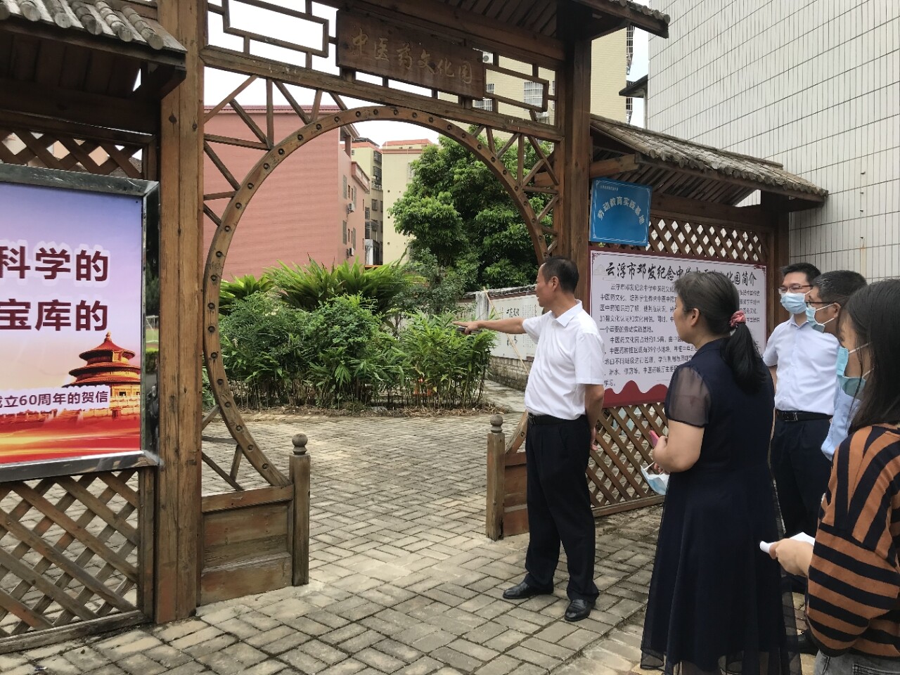 市中医药局一行实地查看了邓发纪念中学中医药文化园、中医药文化展馆等场所,在听取有关工作人员的介绍,邓发中学在中医药文化氛围营造以及宣传科普中取得了一定成绩,大家就共同开展中医药文化进校园工作提出两点工作建议:一是建设开放式的有云浮岭南特色的中药植物园。可结合开展劳动实践课程的形式,让学生在参与劳动的过程中,学习了解中草药的相关知识,传播传统中医药文化。二是丰富中医药文化展馆内涵。除了展示中药材标本外,还可以通过展示中医趣味故事、中医影视资料等多种形式宣传科普中医药文化,提高学生们了解中医药文化的兴趣。